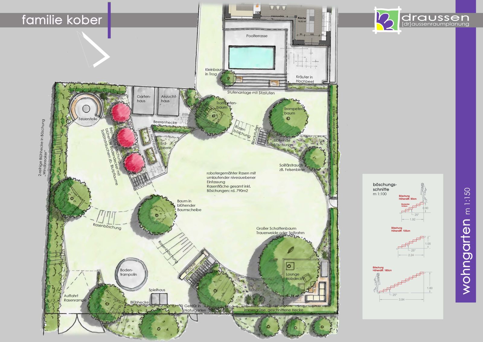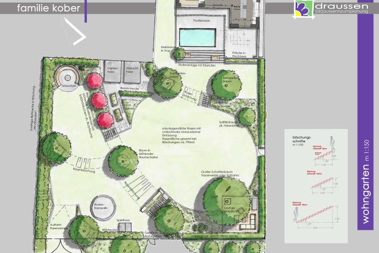 der wohngarten, der mit geschickt angeordneten böschungen die natürliche "welle" des bestandsniveaus aufnimmt, den garten gliedert und platz zum genießen, spielen und loungen bietet