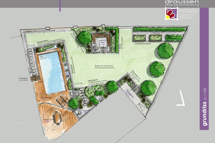 das erhöhte naturpool bietet platz zum plantschen und schwimmen, im vertieften loungbereich kann gechillt werden und wenn der großer hunger kommt sind die gemüsehochbeete und die naschhecke auch nicht weit.