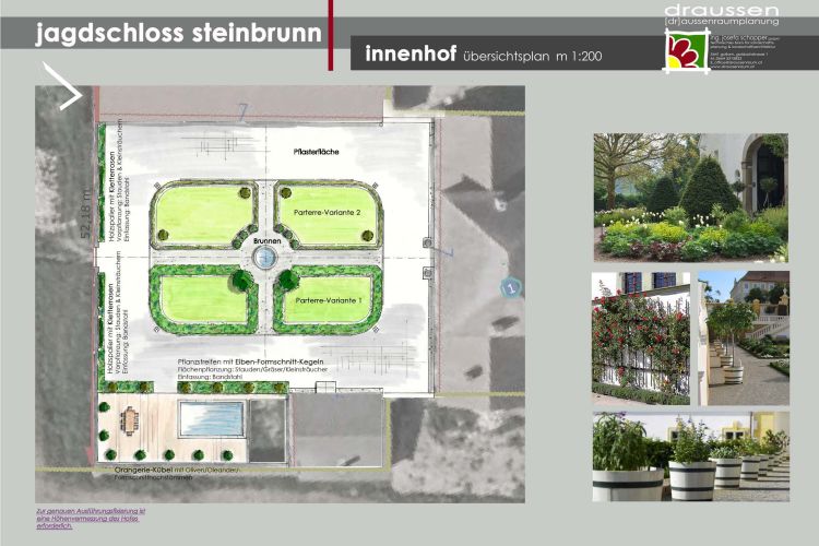 in barocker anlehnung sollen im innenhof parterreflächen entstehen, die mit bewässerungsanlage und rasenroboter jedoch alle modernen stückerl spielen.
