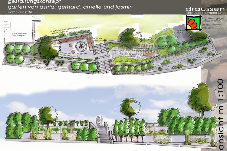 durch verschiedene ebenen wird die "störende" böschung zur straße zum gegliederten wohngarten.